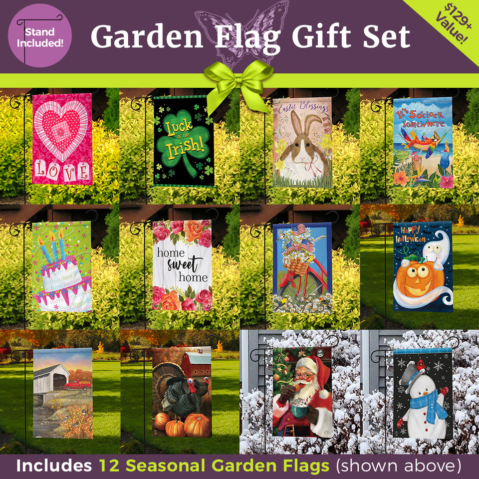 To make shopping extra easy this season, we've even offer Gift Sets with everything needed for the first-time home owner or beginner decorator to start adding life and color to their front lawn. Our bestselling Garden Flag Gift Set includes 12 of our most popular flags selected to represent the Seasons and Holidays throughout the year and the hardware needed to display them.